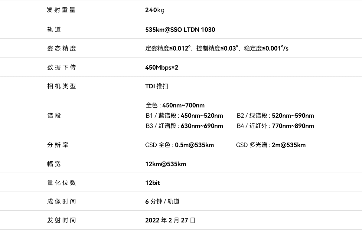 泰景三号01星是中国首颗由民营企业研制0.5m分辨率遥感卫星,卫星平台采用模块化小卫星平台,整星重量240kg,携带电推进系统,为卫星提供变轨和轨道高度维持能力,卫星设计寿命5年以上,对于国土资源监测、地理测绘、城市规划、能源矿产等诸多领域都具有很高的商业价值,可向用户提供全球范围内高空间分辨率、高时间分辨率的卫星遥感图像。